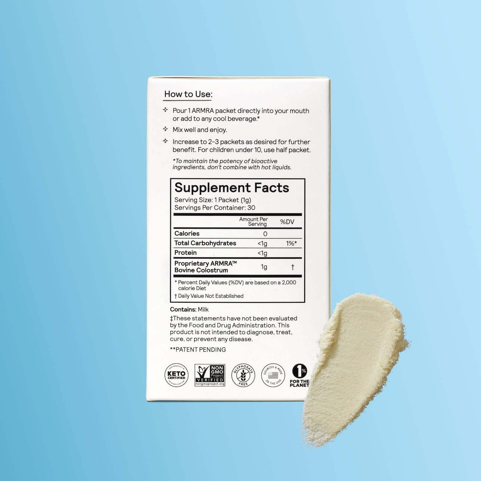When you take colostrum you fuel your body with potent prebiotics that support your microbiome, a host of peptides and antibodies that strengthen your immune barriers, and dozens of antioxidants and bioactive molecules that support cellular pathways throughout your body, for synergistic revival of your whole body health.